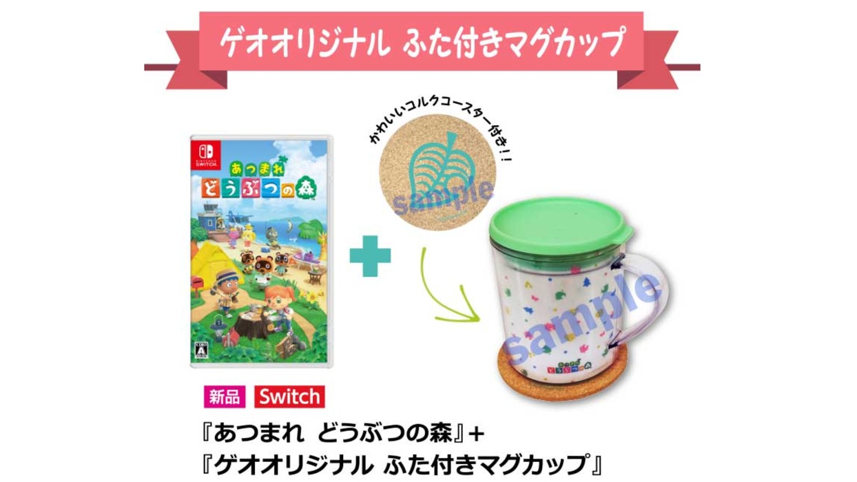ゲオ限定予約特典は、あつまれ どうぶつの森デザインの「ふた付きマグカップ」。可愛らしいコルクコースターも付属し、オール樹脂製なので “軽い” というのも嬉しいポイント。