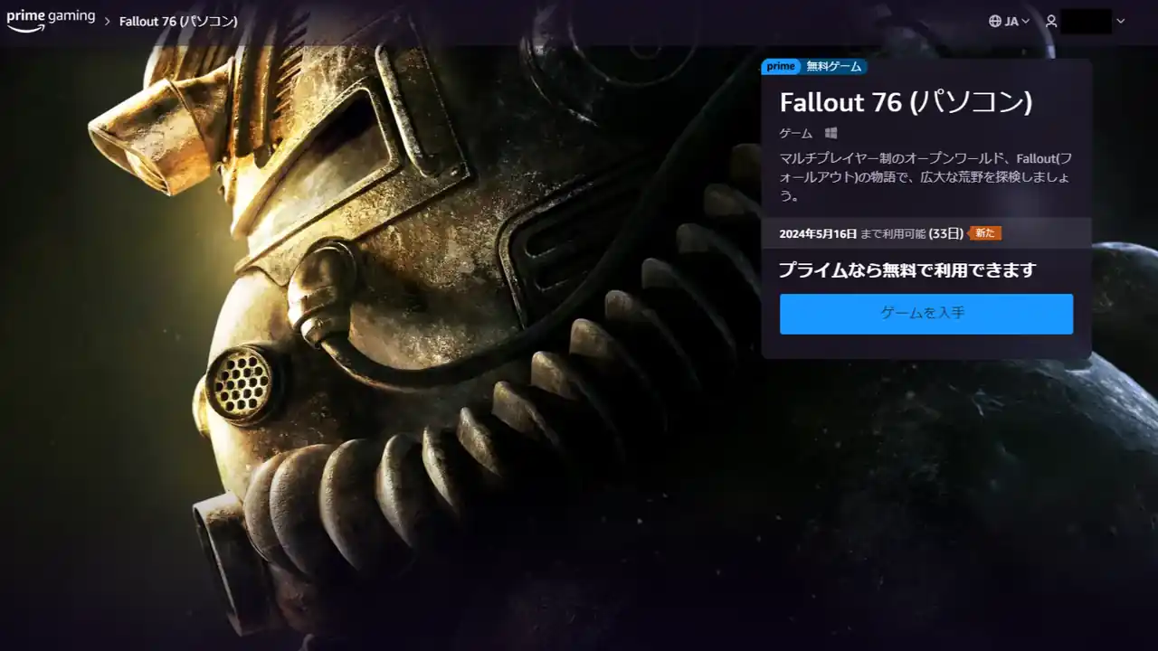 Prime Gamingにて、2024年5月16日までシリーズ初のオンラインオープンワールドRPG「Fallout 76」が無料配布中。